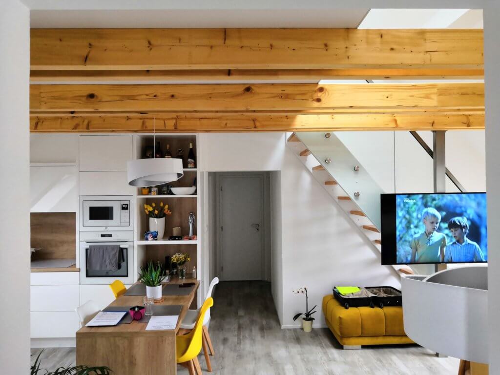Pro investora jsme nejdříve zpracovali studii vestavby bytové jednotky do stávajícího podkrovního prostoru. Byl vytvořen 3D model objektu s několika náhledy jednotlivých částí bytu, pro lepší představu investora o finálním vzhledu. Po společných úpravách a přizpůsobení dispozice a interiéru přání investora byla z modelu vytvořena dokumentace pro podání na úřady. Pro investora byla také zajištěna inženýrská činnost s podáním na všechny dotčené orgány a získání stavebního povolení.